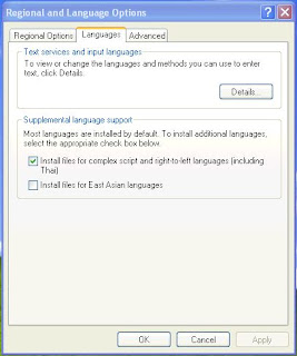 3. ਇਸ ਵਿੱਚ ਲੈਂਗਵੇਜਸ (language) ਬਟਨ ਨੂੰ ਚੁਣੋ। “Install files for complex script and right-to-left languages (including Thai)” ‘ਤੇ ਸਹੀ (ਠੀਕ) ਦਾ ਨਿਸ਼ਾਨ ਲਾਉ ਅਤੇ ਓਕੇ ‘ਤੇ ਕਲਿੱਕ ਕਰੋ।